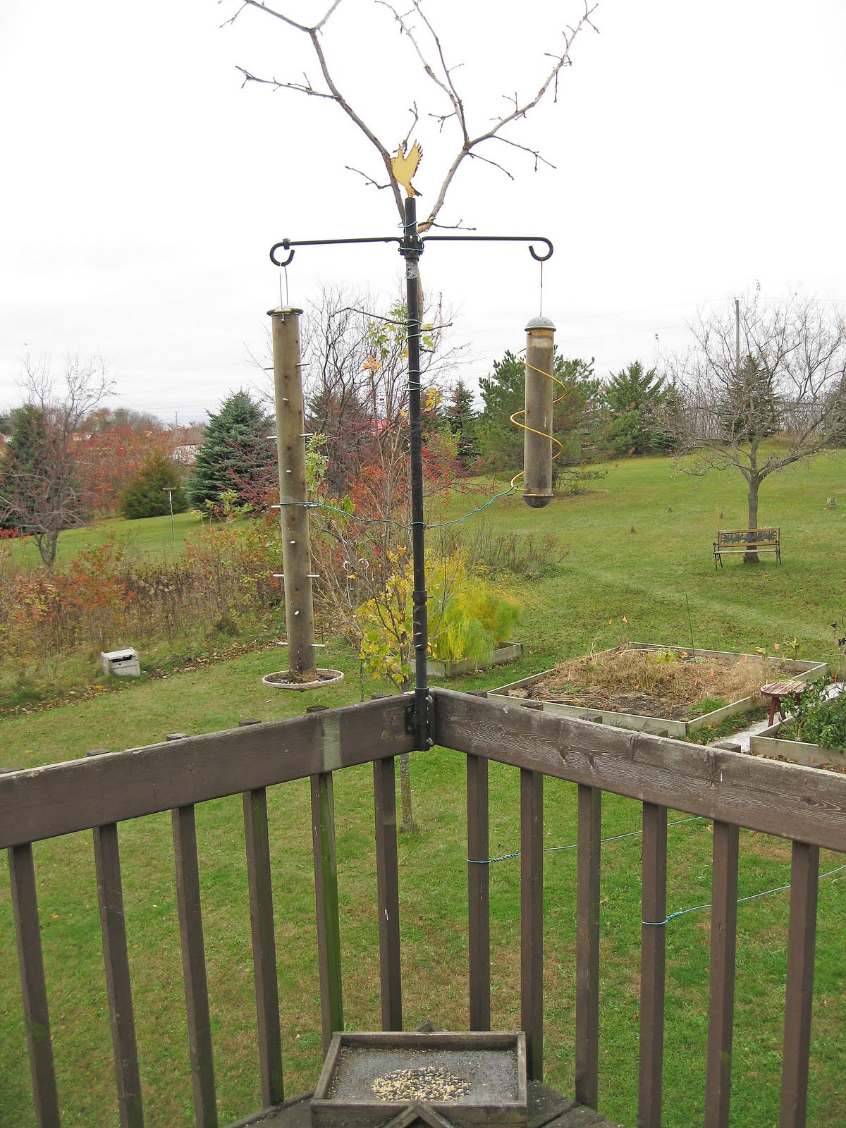 By now I'm sure most of you have heard about (or even experienced it for yourself) the wild weather system that passed through Minnesota earlier this week. Our house sits up on top of the hill and we catch a lot of wind. Some of my trees have gotten big enough to function as a windbreak -- especially northwest winds -- but most of the wind in this storm came from the west-southwest and I don't have any big trees close enough to the house to block winds from that direction. The finch feeder pole attached to my southwest facing, second story deck was no match for 50+ MPH gusts and this is the awful sight I woke up to last Thursday morning.